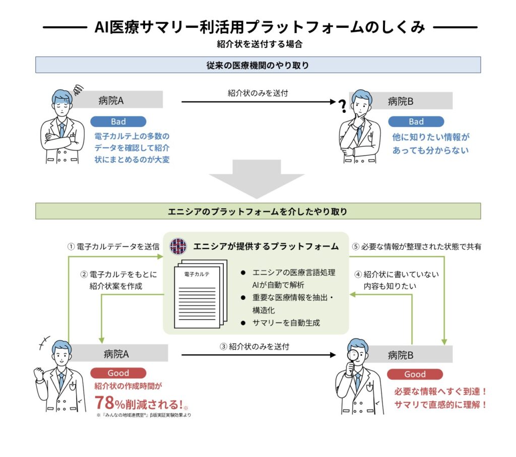医療向けAIソフトウェア開発を行うエニシア株式会社(本社:京都市左京区、代表取締役:小東茂夫、以下、エニシア)は、医療機関に蓄積される電子カルテの自由記述(非構造化データ)をAIが自動で解析・構造化し、利用者の目的に応じた最適な形で情報を提供する「AI医療サマリー利活用プラットフォーム」に関する特許を取得しました。本技術は、地域医療連携の際に生じる“カルテを読み解く負担”を大幅に軽減し、臨床現場における情報共有の質とスピードを向上させることが期待されます。